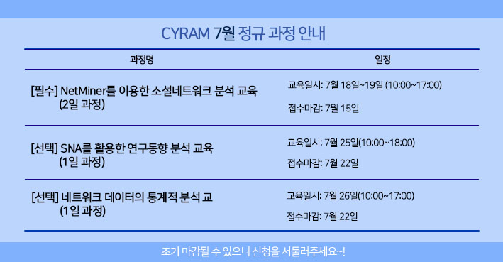 본 교육은 소셜 네트워크 분석 입문자를 위한 교육으로 소셜 네트워크 분석 기초 이론에 대한 이해와 NetMiner 실습을 통해 소셜 네트워크 분석 연구 능력을 함양하기 위한 과정입니다.