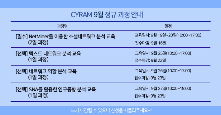 ※ 본 교육은 심화과정으로 선수과목이 있습니다. 선수과목: NetMiner를 이용한 소셜 네트워크 분석 기본교육