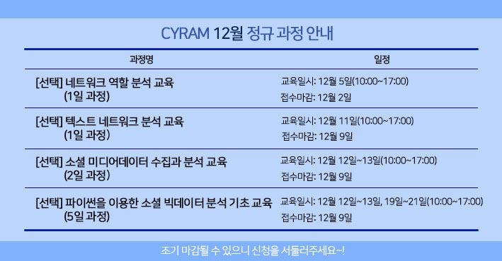 ※ 2개 교육 이상 신청을 원하시는 분은 <패키지 교육 수강권>을 구매하시면 15~20% 할인된 금액으로 교육을 수강하실 수 있습니다. 단, '파이썬을 이용한 소셜 빅데이터 분석 기초 교육'과 '소셜 미디어 분석 교육' 수강권을 패키지 수강권으로 구매하실 경우 별도로 말씀 해주셔야 합니다.