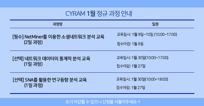 본 교육은 소셜 네트워크 분석 입문자를 위한 교육으로 소셜 네트워크 분석 기초 이론에 대한 이해와 NetMiner 실습을 통해 소셜 네트워크 분석 연구 능력을 함양하기 위한 과정입니다.