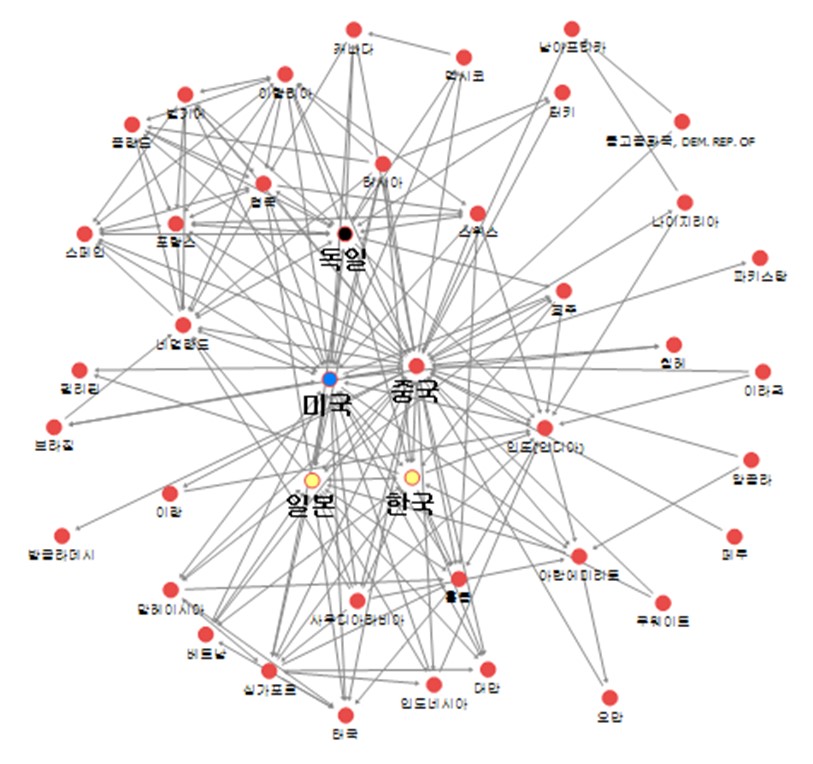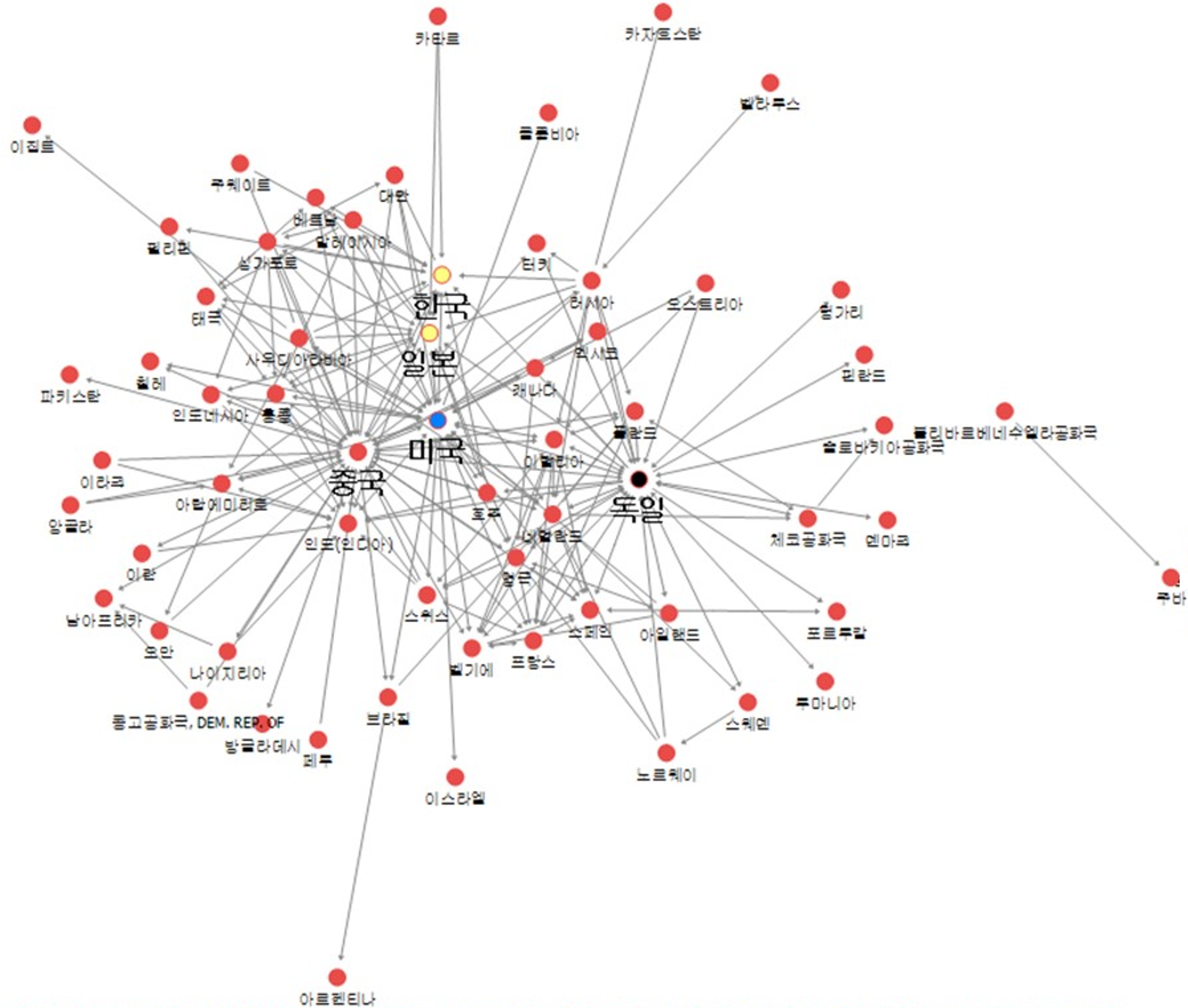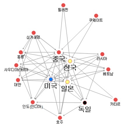 여기에 중국은 호주*러시아를 포함한 동남아 국가들의 중심국으로 위치해 있고, 일본은 미국*중국*한국과, 한국은 일본의 관계망에 더해 베트남을 아우르고 있습니다.