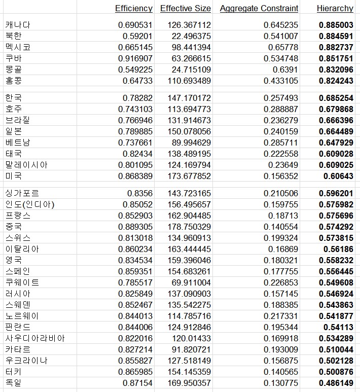 먼저 흥미롭게 보이는 것은, [캐나다*멕시코*쿠바] 등의 나라와, [홍콩*몽골], 그리고 [북한]의 Hierarchy 지표가 0.8 이상으로 매우 높다는 것입니다.