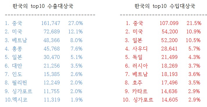 한국과 중국의 수출입 내역을 함께 들여다보면 자연스럽게 미국이 도출되어 나옵니다.