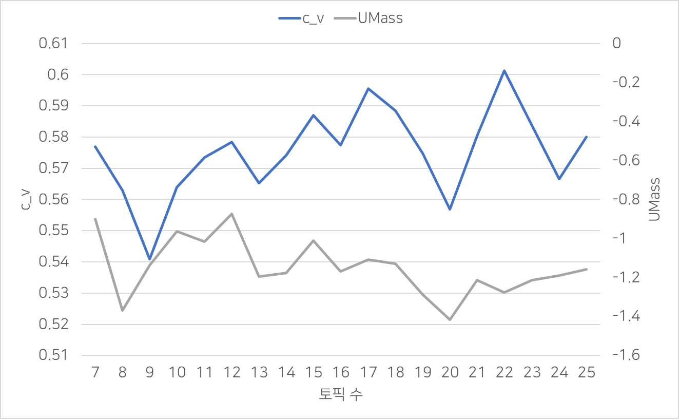 이번에 수집한 뉴스 데이터에서는 토픽 일관성 계산 결과 중 c_v 값을 참조하여 아래와 같이 17개 토픽을 뽑았습니다.
