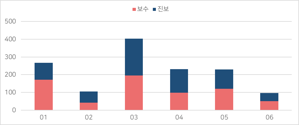 이번에는 주제별로 보수, 진보 채널의 보도량을 확인해보았습니다.