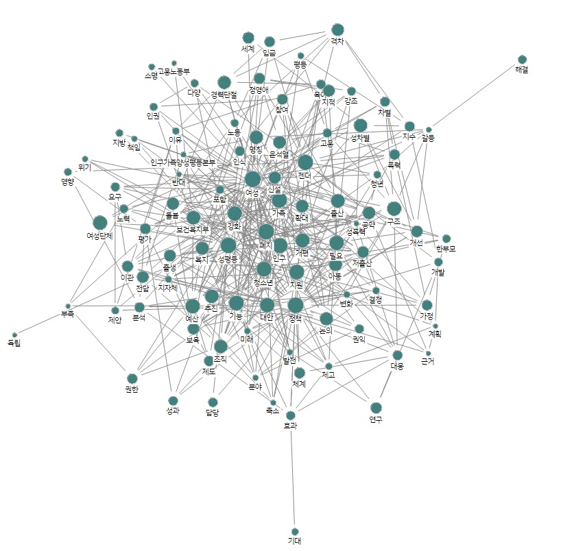 "폐지" 주변에 여성, 성평등, 인구, 청소년, 신설, 확대, 대안, 개편, 확대 등의 단어가 위치하는 것을 확인할 수 있습니다.