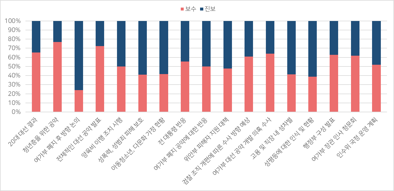 진보 채널에서는 여가부 폐지 후 방향, 관련 업무 분야 현황(성폭력 피해 보호, 아동청소년, 다문화 가정), 성평등/성차별에 대한 보도가 많은 것으로 나타났습니다.