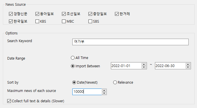 먼저 News Data Collector (상세보기>>) 를 활용하여, 대선 전후 '여가부' 관련 국내 언론사 뉴스를 수집했습니다.